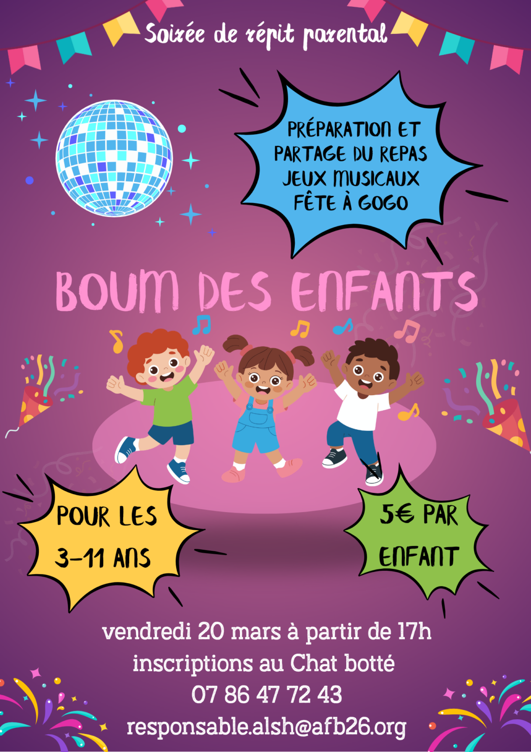 Une soirée rien que pour les enfants, pour le répit des parents ! Profiter d’un répit parental pendant que vos enfants feront la fête! vendredi 20 mars 2026 à partir …