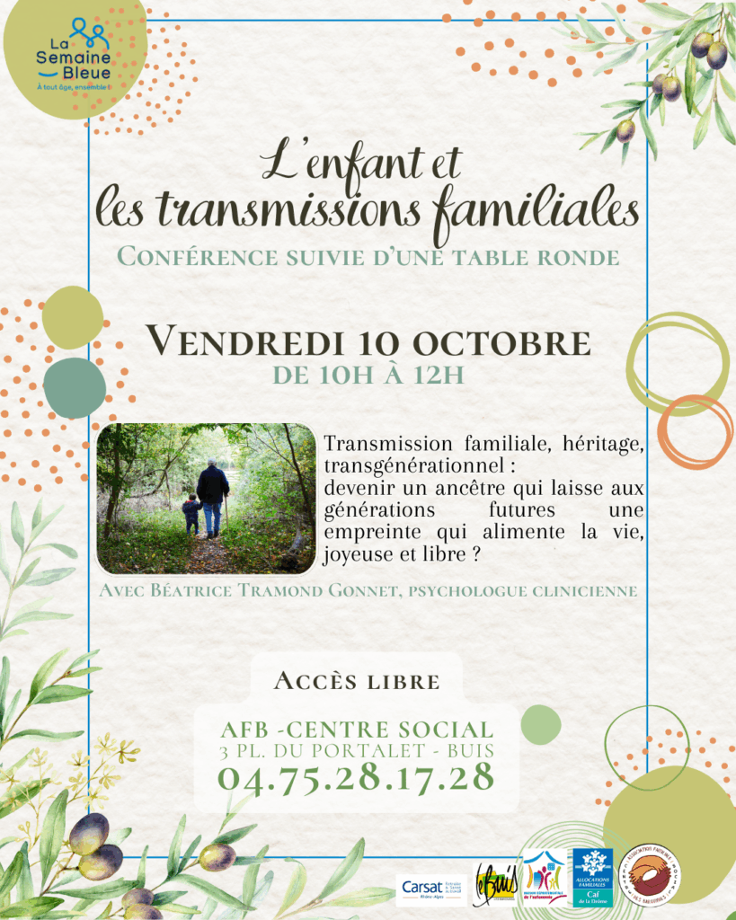 Dans le cadre de la Semaine Bleue dont le thème en 2025 est : “Vieillir, une force à partager”, le centre social vous propose une conférence sur les transmissions familiales, suivie d’une table ronde.