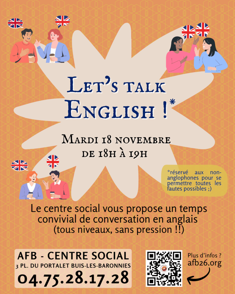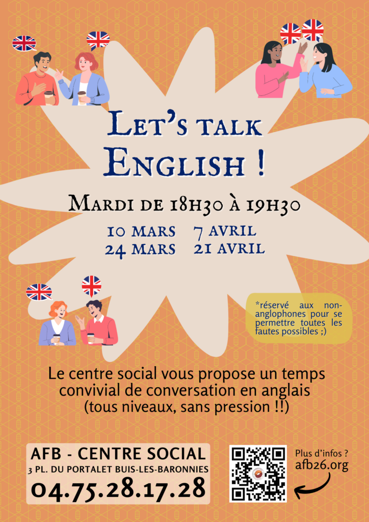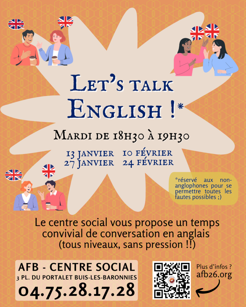 “Let’s Talk English” n’est pas un cours mais un temps de conversation en anglais, où l’idée est d’oser parler anglais, sans aucune pression !
