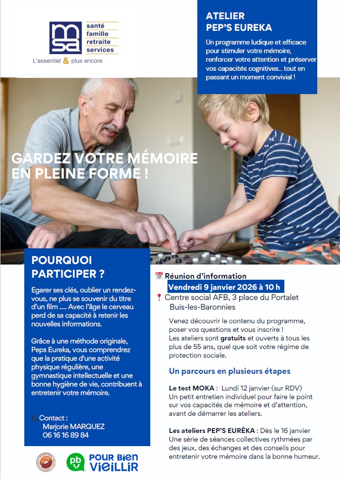 Pour cela, La MSA Ardèche Drôme Loire vous propose le programme PEP’S EURÊKA, des ateliers gratuits et ouverts à tous les plus de 55 ans pour entretenir votre mémoire, votre attention et votre concentration dans la vie quotidienne.