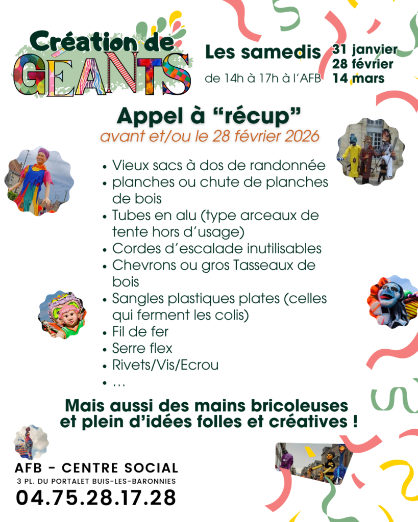 Pour les prochains ateliers qui se dérouleront le samedi 28 février et le samedi 14 mars, n’hésitez pas à ramener du matériel qui ne sert pas chez vous et/ou qui vous inspire pour donner vie à ces géants. Ces ateliers sont destinés plutôt aux adultes, mais les enfants peuvent venir amener leurs idées et bricoler des petits éléments, accompagnés d’un adulte responsable.