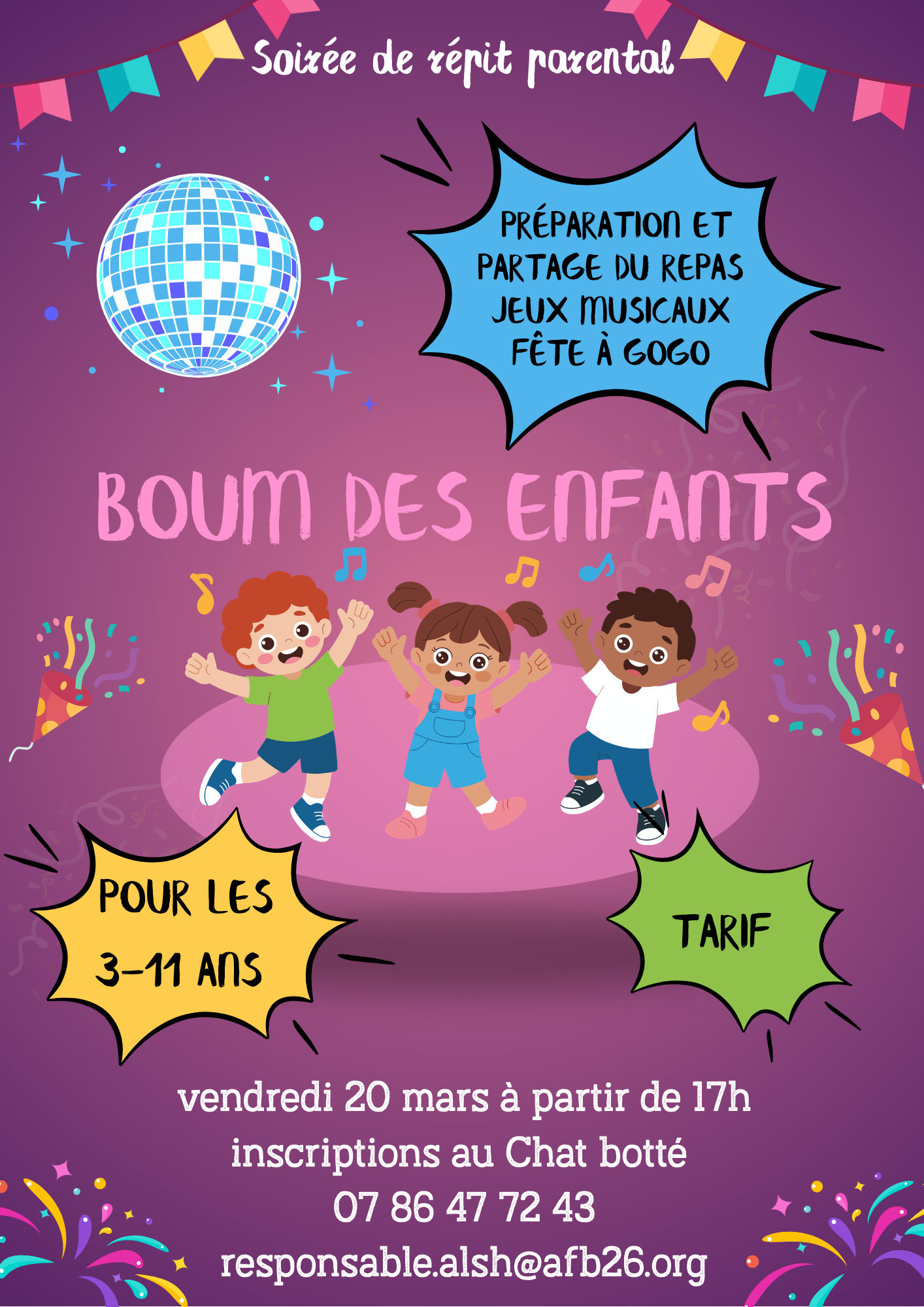 vendredi 20 mars 2026 à partir de 17h ce sera la Boum des enfants au Centre Social, une soirée réservé aux enfants et où les parents pourront profiter d’un temps bien à eux.