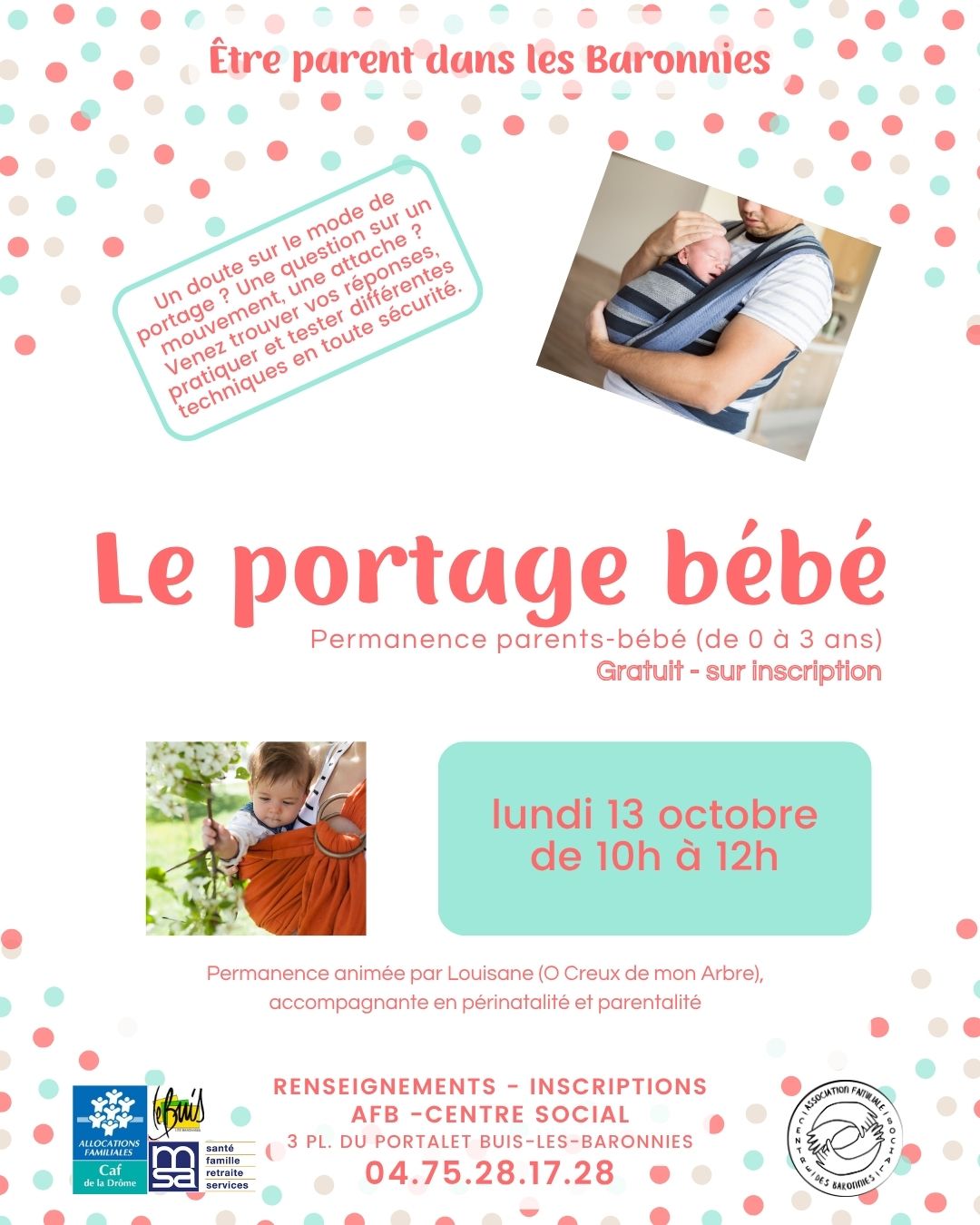 Une permanence pour parler et pratiquer le portage physiologique Permanence : lundi 13 octobre de 10h à 12h (AFB, salle du bas) Animée par Louisane, O Creux de Mon Arbre), …